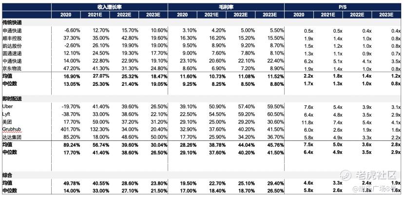 根据顺丰控股2021年3月28日的增资及关联交易公告,顺丰同城在上一轮战略投资的估值为109亿元人民币,对应2020年营收48.4亿的PS为2.3x。11月29日顺丰同城计划将正式启动招股,根据市场消息,顺丰同城估值投前约110亿元人民币,投后将在131亿元人民币左右,对应2022年PS为1.1-1.2x左右。不得不说,顺丰同城与上一轮几乎flat round的IPO发行价,是非常有诚意的。对比闪送在一级市场上的估值(根据IT桔子数据,2021年3月D2轮投后估值20亿美元),顺丰同城显然是一个性价比更高的投资选择。