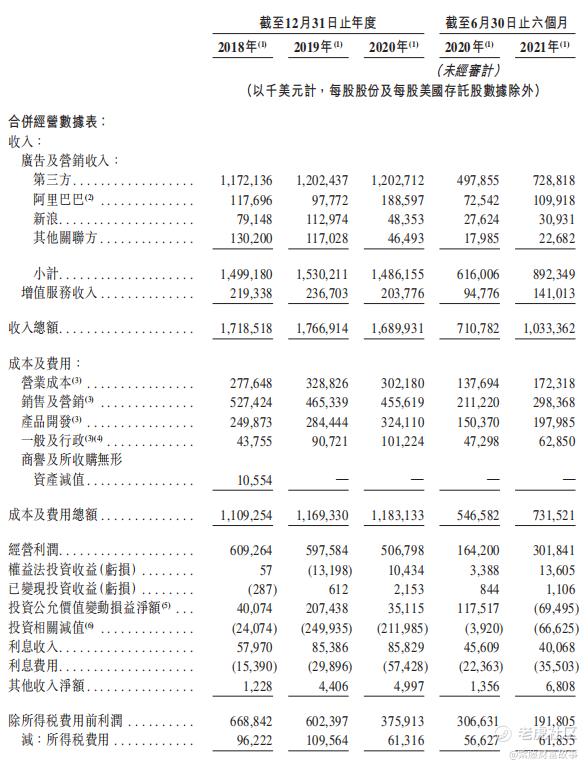 财务数据方面,2018年、2019年、2020年及2021年上半年,微博的营业收入分别为17.19亿美元、17.67亿美元、16.90亿美元及10.33亿美元,同期净利润分别为5.72亿美元、4.95亿美元、3.13亿美元及1.31亿美元。