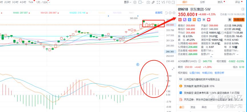 3.$京东集团-SW(09618)$ 。早盘策略也提到了目前就是横盘整理形态,350下方会有较强支撑,盘中最低打到348附近,尾盘继续反弹,也算比较符合预判了,目前走势继续横盘中,感觉可以在区间内来回做T,还是比较舒服的。
