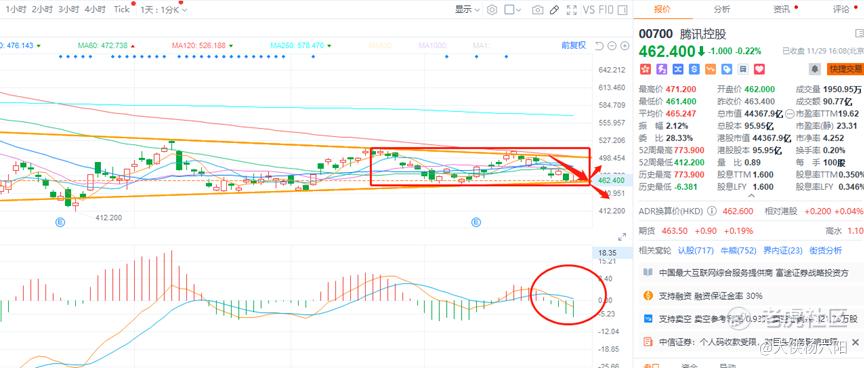 2.$腾讯控股(00700)$ ,今天再次冲高回落,早盘策略也强调了在470上方会有较强阻力,盘中表现得也是非常弱,午后一路回撤461附近,没有什么反弹力度,在460附近依旧有所支撑,明天就需要重点观察460的得失了,目前技术面偏空,还是需要注意风险。