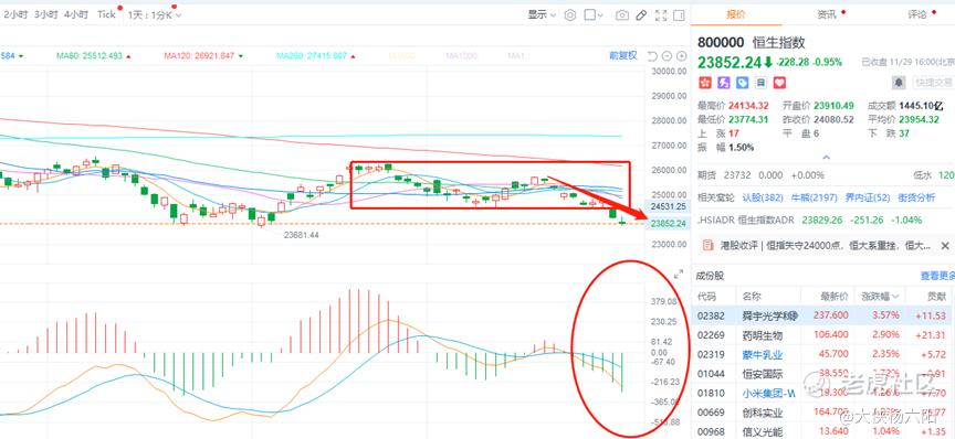 今天港股表现得比想象中要弱,盘中弱势震荡让人无从下手,新能源等逆势走强,东方电气大涨7.7%,科技股集体走弱,美团跌近7%。从目前各国的反应来看,这次南非新冠疫情影响可能会超出想象,所以后市可以多从疫情受益板块入手,比如医药,航运,新能源等。等这波砸出黄金坑,低吸入手比较好。