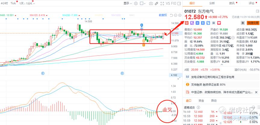 4.东方电气,今天大涨了7.71%,走的也是蛮强的了,早盘策略也提到该股有走强的预期,从技术面上看,该股还在11-13的区间内震荡,但MACD等技术指标已经开始走好,明后天如能确认站稳12元可考虑入手的了。可以多关注一下。
