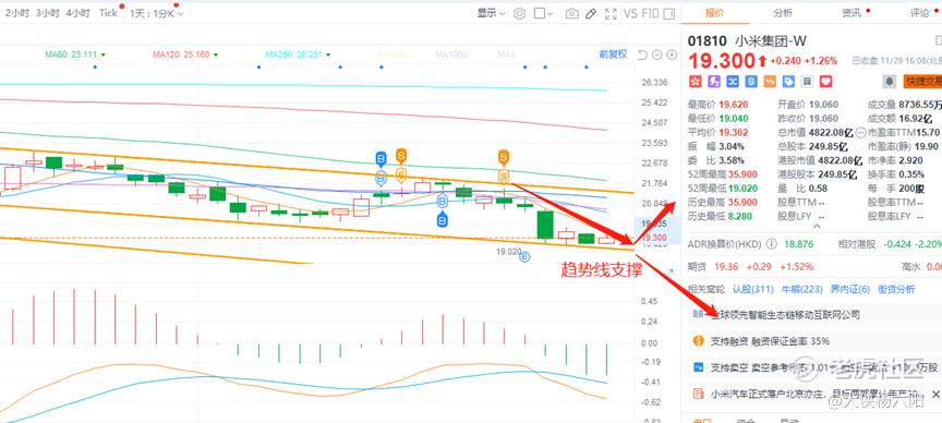 5.小米集团-W,今天低开高走,再次受阻于5日均线,目前该股在19元的支撑还是比较强的,也是这波下跌的下降趋势线下轨,如果明后天继续跌破就要往16-17附近寻求支撑了,所以本周的重点就是看19元的得失,感觉还是等出现探底信号后再考虑抄底了,最起码反弹要站稳5日均线吧。