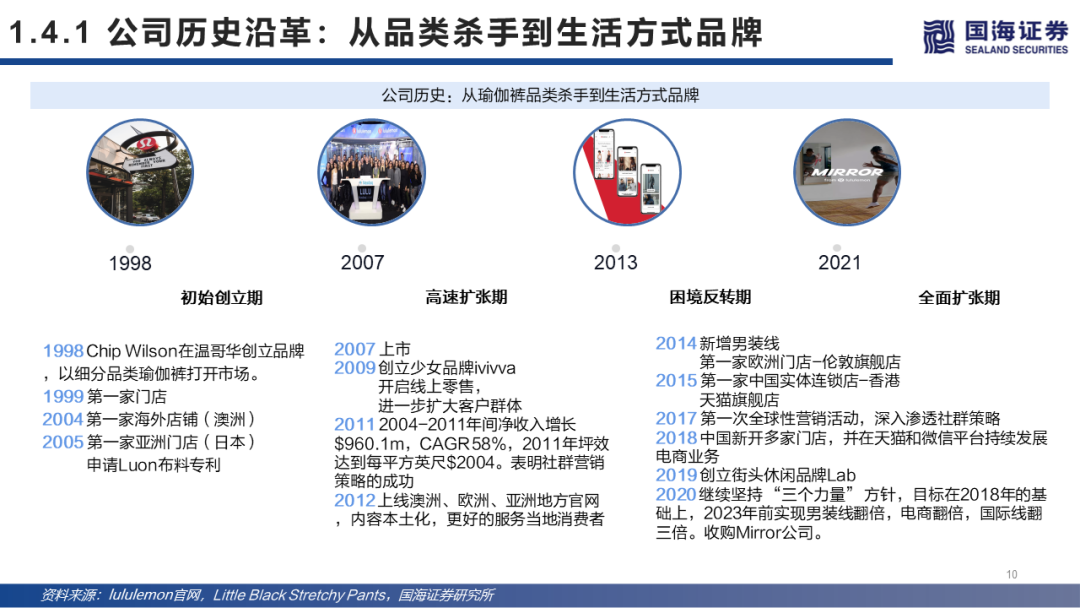 运动休闲服饰行业异军突起的露露乐蒙(lululemon)是以生活方式为灵感的运动休闲服饰品牌,通过战略调整和稳定的供应链,构筑了品牌产品力壁垒:全球知名的北美高端运动休闲服饰品牌lululemon主要产品为女士和男士体育服饰及用品,包括瑜伽、跑步等运动所需的运动上装、长/短裤、袜子和内衣等,以及包袋、水壶、瑜伽垫和发带等,其明星产品女士瑜伽裤尤其受到消费者欢迎。该类型产品针对不同场合穿着提供不同设计、剪裁、面料、工艺给热爱运动、生活的顾客,通过长期稳定出品的供应链较为集中出货,构筑产品壁垒。复盘公司发展二十余年,lululemon以小众运动为切入点创业、在金融危机之时开启布局线上、多次试错、管理层危机和最后成功向男装扩张等重要历史节点过后,终于摸索出公司自己独特的“以生活方式为灵感的品牌”这一定位。