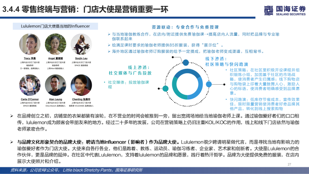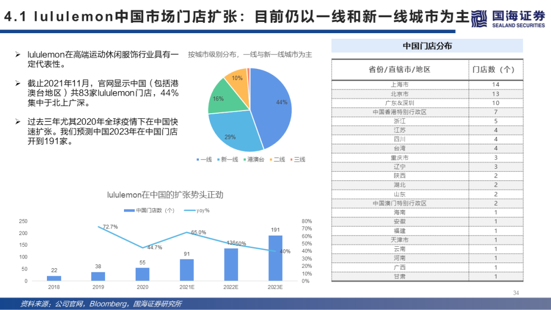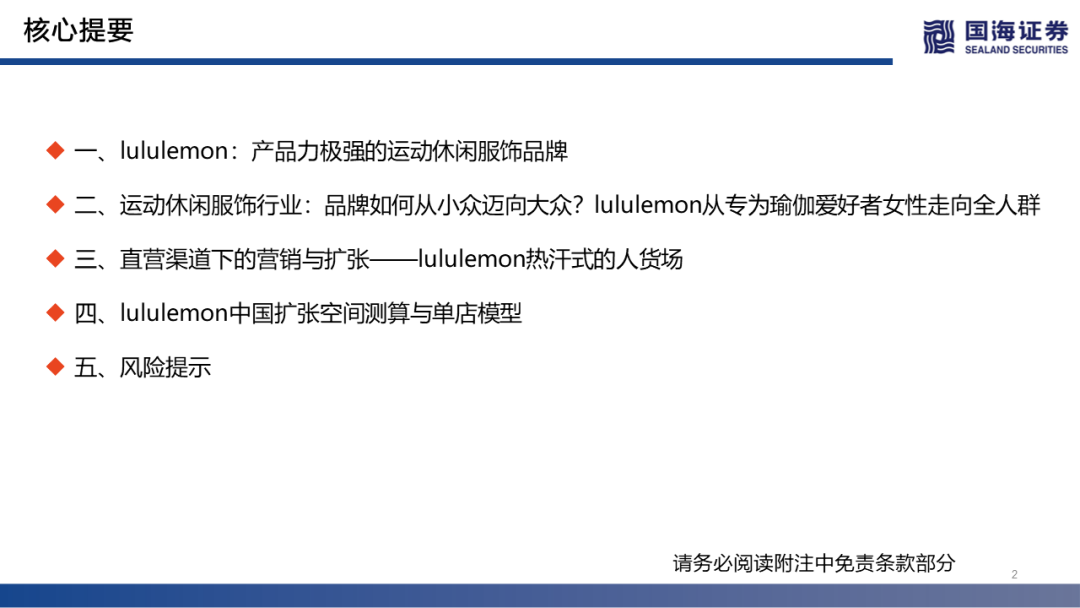 风险提示:宏观环境风险:消费者的消费力和消费意愿受宏观经济周期和突发事件(如新冠疫情)影响,消费存在不确定性;供应链风险:受疫情/其他突发事件影响,服装品牌上游供应链存在延迟发货等风险;行业头部公司管理层风险:行业头部公司管理层离职、意见冲突等风险;估值风险:市场风格变化,估值中枢下滑风险;调研风险:调研样本过小不足以反映真实情况风险;研究方法风险:中国市场与海外市场并不具有完全可比性,露露乐蒙在中国的门店扩张测算仅供参考,未来存在一定的不确定性;其他风险。