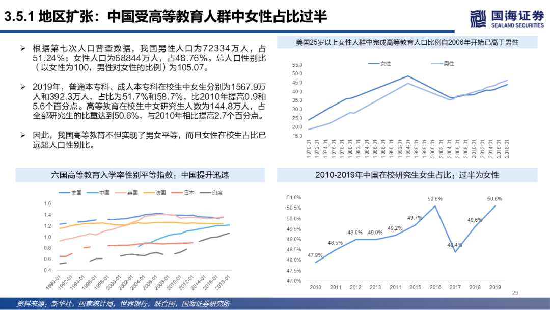 行业翘楚lululemon的成功之道是坚持直营门店(Vertical Model)进行社群营销和精细运营,人、货、场得以扩张,打开品牌成长天花板:公司从创立之初就坚持线下直营门店,我们认为这是品牌在品类、人群、场景的扩张顺利之重要原因所在。直营在人员、创新、营销等各个方面对比传统批发模式均有革新——高端定位的门店、高素质店员交互体验,社区运动KOL的社群营销顺利进行,由此建立社区成员“热汗式”的联结,扩大品牌的影响力。消费场景和使用场景的重叠增强了产品的感官冲击力。在产品壁垒、优质渠道与品牌形象共同影响下,产品的扩品类获得成功。同时因为对运动垂直领域人群的影响,从健身房到家庭,不同场景的扩张也被公司给予厚望。反映在公司各项利润率和经营效率上,体现出正是成功的全面扩张让公司迎来运营效率提升。地区扩张上,公司在北美以外地区扩张速度较快(如中国受高等教育人群中女性占比近年超50%,也在疫情期间获得较高增长)。