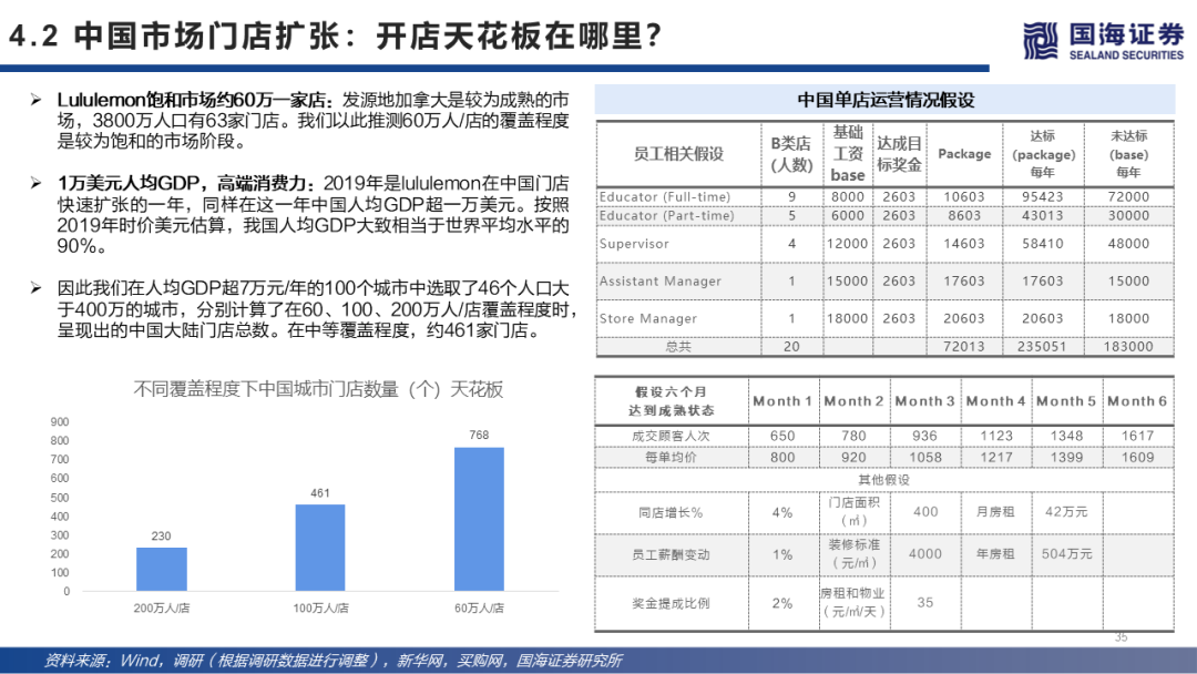 lululemon中国市场扩店测算与单店模型分析:目前中国83家店,70家在中国大陆。大部分位于一线和新一线城市。对人均GDP超一万美元和人口较多城市进行重叠测算,根据覆盖水平测算结果显示低覆盖度200家店和长期高覆盖度700家店。据调研,中国门店单店6个月可达到成熟阶段,经过假设和对EBITDA进行DCF估值,单店绝对估值超3.6亿元人民币。