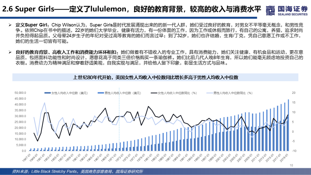 Ath-leisure运动休闲风超三千亿美元市场,供有品位的Super Girls多场景穿着存在于lululemon的基因里,形成品牌护城河:根据GrandView Research,运动休闲风服装全球市场已超3000亿美元,未来将以超8%的CAGR增长。lululemon已进入的运动市场总计规模超2000亿美元,且市占率在重要市场靠前。在多品牌的对比中,其追求舒适、共赢而非竞争的品牌精神内核和将其与其他品牌区分开,并在高端产品中引领线下门店消费体验。据创始人在其著作中分享,上世纪末开始北美地区女性中受高等教育的人群占比提高,收入和消费水平提升,追求有品位的优质产品。lululemon初始客群正是这样一群热爱运动和生活、穿着舒适的lululemon产品通勤/运动/休闲的“SuperGirls”。