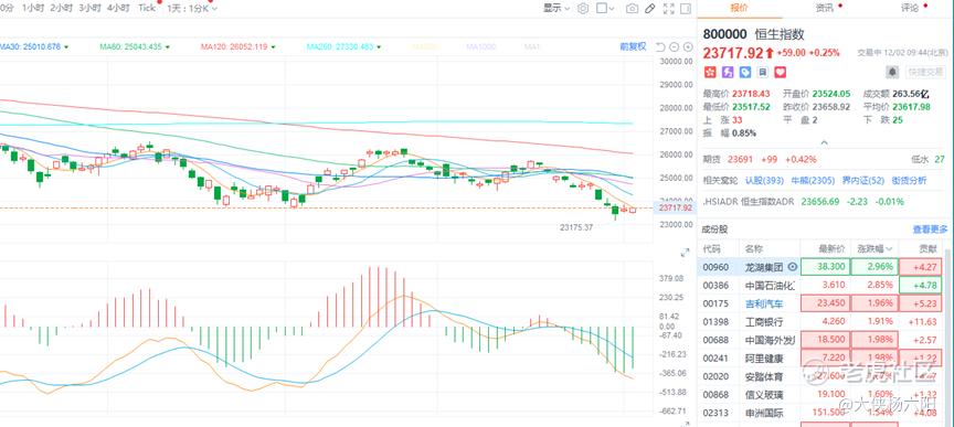 今天恒生指数早盘继续低开高走,23000点附近还是有较强支撑,上方阻力在24000点,早盘银行证券等权重股继续护盘,新能源等人气赛道开始活跃,这都是比较好的表现,技术面指标目前开始修复,板块方面,科技股现在继续分化,风电,光伏,绿电等新能源轮动明显,可以重电关注一下,医药股机会仍在。