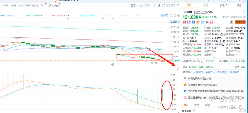 3.$阿里巴巴-SW(09988)$ ,昨天复盘的时候也讲了,昨天的小阳线是个下跌中继形态,今天早盘跳空低开测试了120的支撑,早盘继续弱势反弹中,盘中的阻力位在124附近,目前抄底风险依旧较大, 感觉还是多看少动吧,目前下降趋势不变。