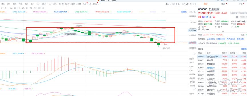 今天恒生指数延续反弹,最终收到5日均线附近,也是9月以来形成的震荡区间下沿处,技术面上有所修复,但仍然偏空一些,从市场板块表现上看,目前主要是靠银行,地产等权重股在护盘拉指数,指数下跌暂时被企稳,不过感觉市场风险反而在累积,这种反弹只是赚指数不赚钱罢了,明天又到周五了,市场有可能变盘选择方向。目前上方阻力继续看24000点附近,下方支撑在23500。所以操作上感觉还是减仓控制好风险,等待方向明朗。
