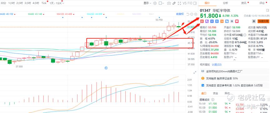 1.$华虹半导体(01347)$ 。今天再次冲高回落,走的有点差强人意,目前市场不好也就这样了,54附近的阻力真是一言难尽,明天需要关注5日均线的支撑了,如果失守短线有回撤10日均线的概率,所以我觉得继续高抛低吸吧,中长线继续看涨不变。