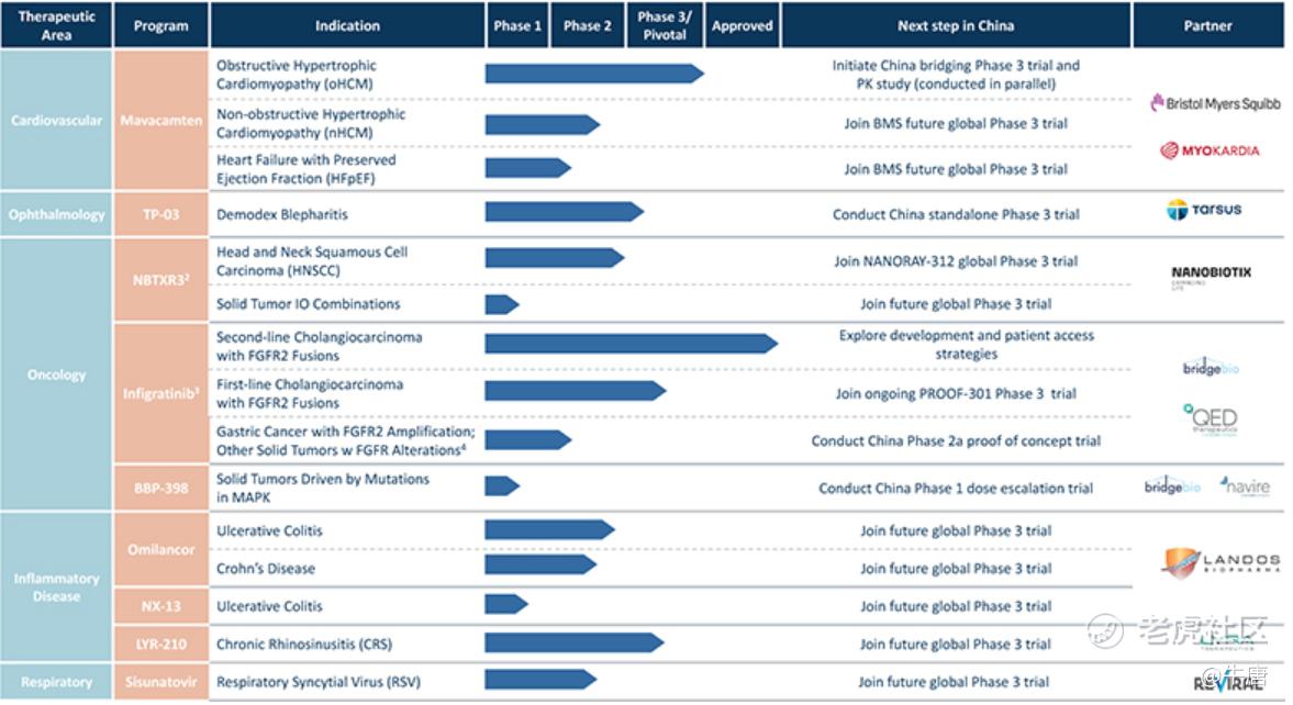 联拓生物现有9个在研药物,涉及的领域包括肿瘤、心血管、呼吸、眼科和炎症五个方面,所有药物均是从海外创新药企业引入,包括MyoKardia(被BMS收购)、Nanobiotix(NASDAQ:NBTX)、Tarsus(NASDAQ:TARS)、Landos (NASDAQ:LABP)、Lyra (NASDAQ:LYRA)、BridgeBio (NASDAQ:BBIO)等企业。