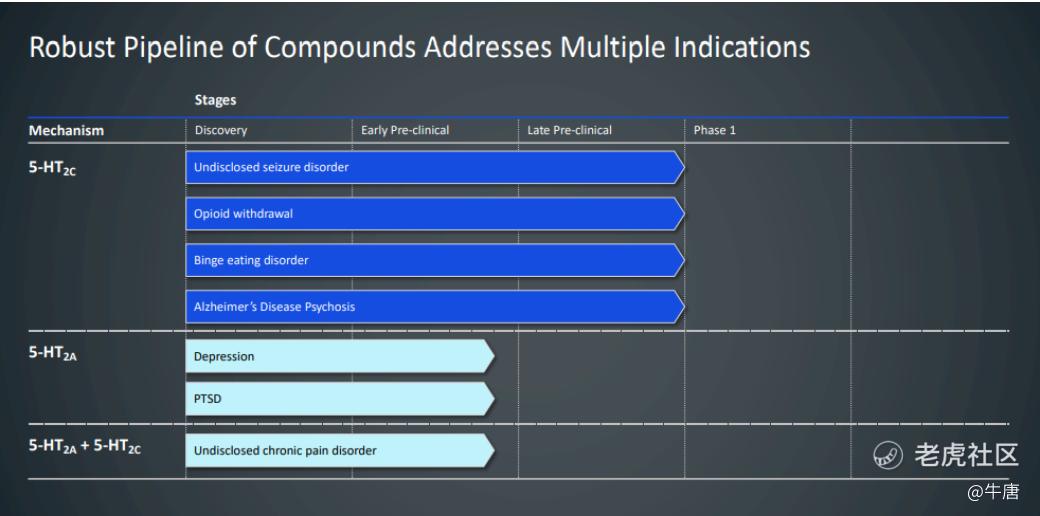 DRUG是一家开发“下一代”非成瘾性迷幻药物来治疗抑郁症和其他神经系统疾病的公司,在研管线有5-HT2A和5-HT2C两个药物,均处于临床前阶段。