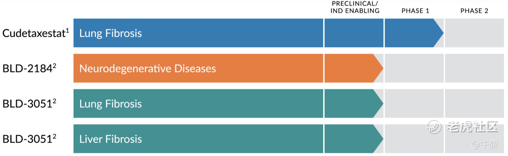 目前公司有4个在研管线,涉及肺纤维化、肝纤维化以及神经退化性疾病,其中靶向Autotaxin的药物cudetaxestat进度最快,处于临床一期。