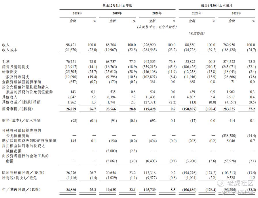 财务数据方面,2018年、2019年、2020年及2021年上半年,公司收入分别为9842.1万元、8870.4万元、12.27亿元及7.63亿元;同期净利润分别为2486.0万元、1962.5万元、1.04亿元及-9378.5万元。于2018年、2019年、2020年及2021年上半年,公司的年内经调整利润净额(非国际财务报告准则)分别为3890万元、2230万元、1.66亿元及3.14亿元。