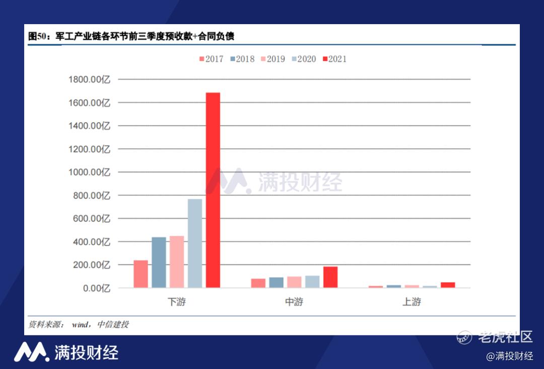 2021年以来,军工产业的采购模式发生了变化,前三季度军工下游企业的合同负债出现了大幅增加,超过1600亿元,一定程度上显示了我国存在备战需求,军品进入了大额采购阶段。大批量订单一方面使得产业链各环节公司规模效应更加显著,另一方面合同负债比例的提升有利于改善军品公司的现金流。预计在未来3年内,军工企业有望因为大规模的交付而迎来利润增长的高峰期。