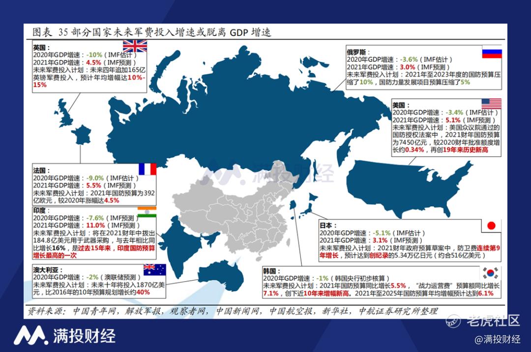 而从世界角度来看,在2021年后疫情时代经济恢复仍存较大不确定性的背景下,部分国家或出于进一步攫取“海外利益”,或出于扩大影响力等原因,均公开宣称未来将大幅提高国防支出。前15大军费支出国中,9个美国盟友国家均不同程度加大国防预算投入,尽管美国在2021财年国防预算增速有所放缓,但整体绝对额仍保持上升趋势。预计2021财年,全球国防预算仍将保持稳定增长。