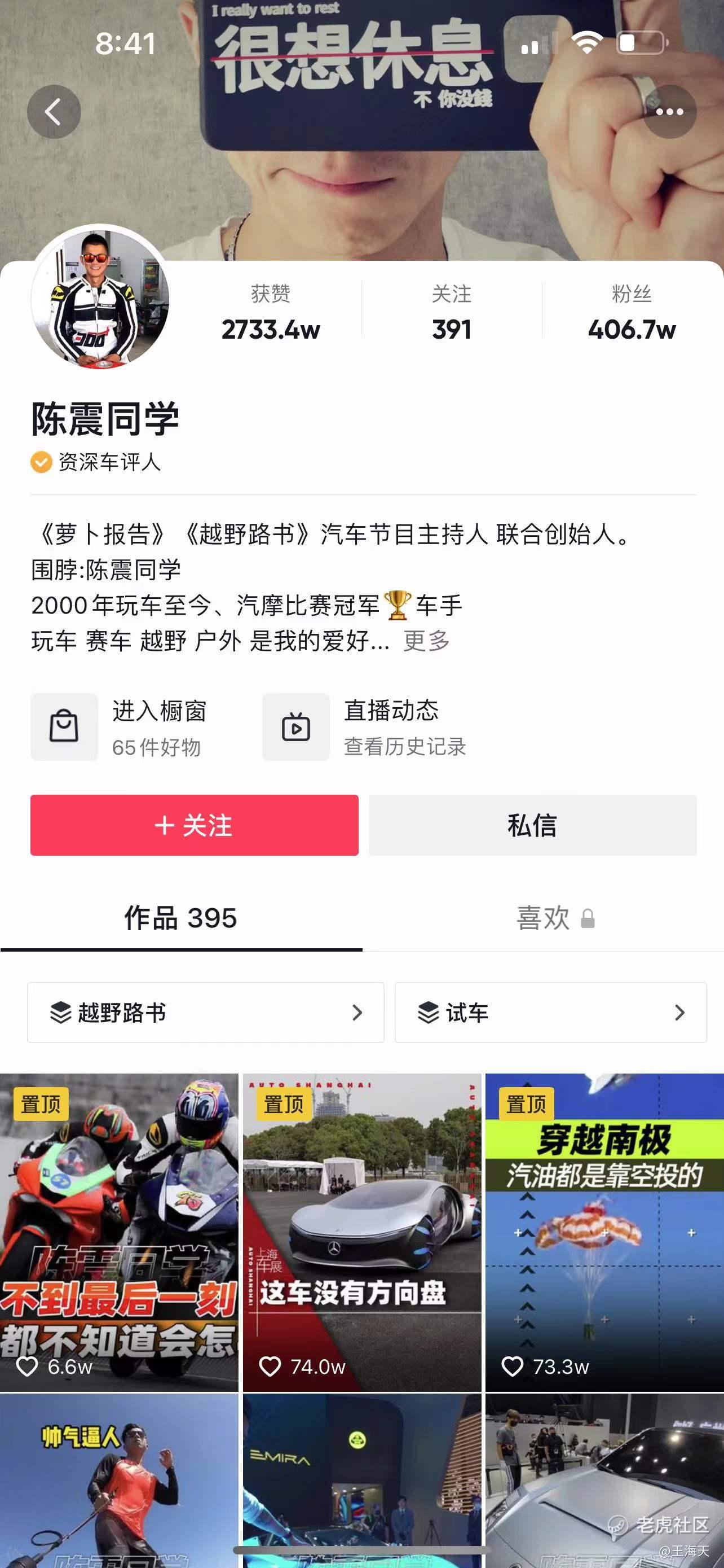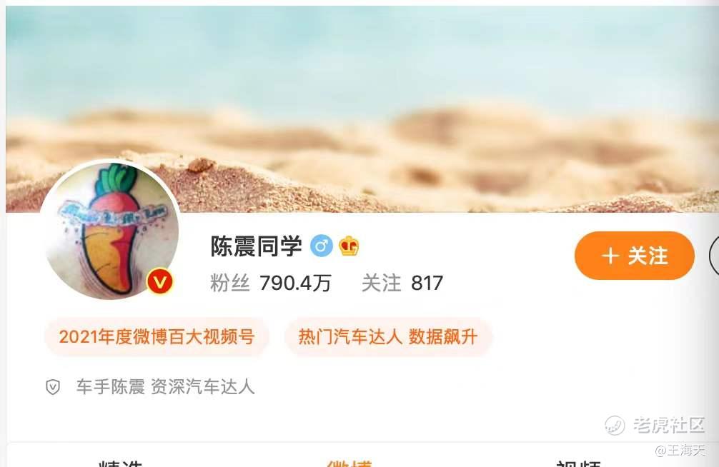 我们来举一个例子:以知名的汽车测评人“陈震同学”为例,微博上有790万粉丝,在抖音、快手、bilibili上同步自己的内容。