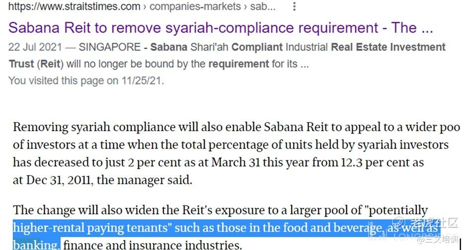 个人对符合伊斯兰教义的 Reit 的条件,其中一项就是资产不能太过奢华,如银行、金融机构、酒店、高档餐厅等,这类行业必须把门面做越高大上越能吸引优质租户。但碍于伊斯兰教义条规限制,sabana reit 的租户都会偏向工业类型资产为主。