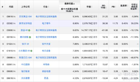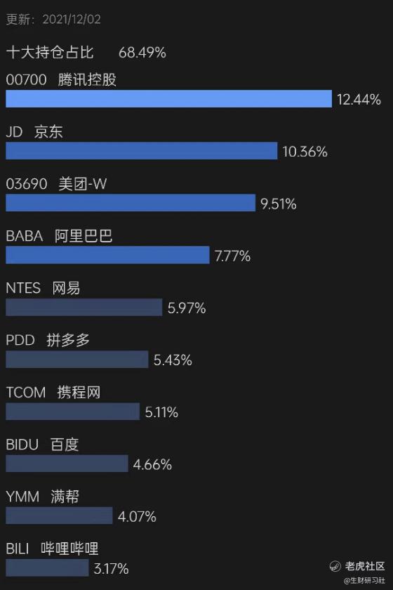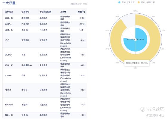 总共50只,代表基金交银中证海外中国互联网指数(QDII-LOF),基金代码164906.sz$中国互联(164906)$ ,场内前一段时间改名为中概互联网LOF,这只既可以在券商场内交易,也可以通过支付宝、天天基金、且慢等场外申购,最新规模69.33亿 份 (2021-09-30),前10大重仓股占比68.7%,详细占比参考下图: