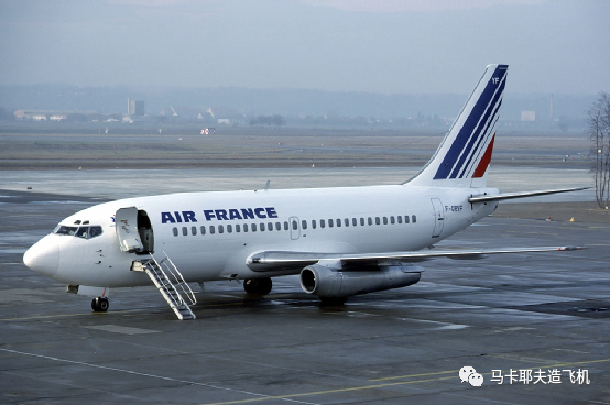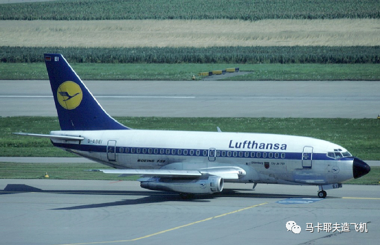 737的第一代,737-100,1967年首飞。737-200是100的加长型,出厂时间也差不多。最早这一代两个型号,发动机用的是普惠JT8D,发动机也还是圆的。
