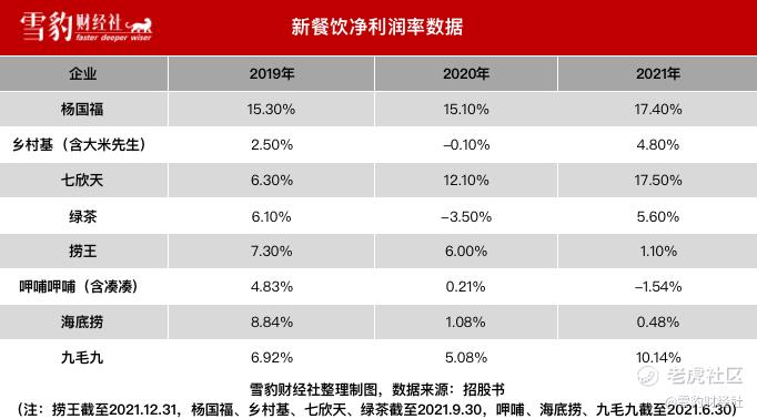 对餐饮企业来说,净利润率在8%-10%的范围是较为正常的。对比已上市的海底捞、呷哺呷哺和九毛九的净利润率,乡村基、绿茶、捞王与这3家基本持平,杨国福与七欣天明显高于行业平均水平。