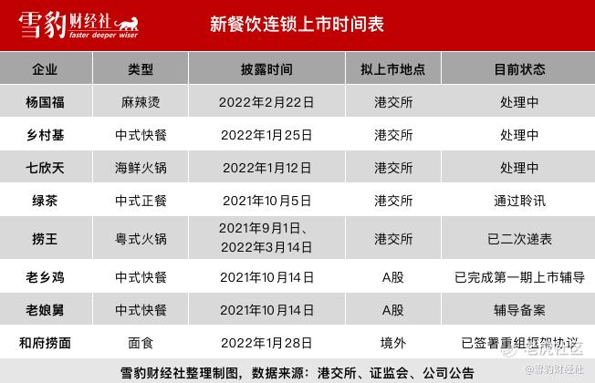 3月14日,在首次上市申请失效两周后,国内粤式火锅品牌捞王在港交所二次递表。在此一周前(3月7日),二次递交上市申请满5个月的绿茶集团有限公司通过港交所上市聆讯,有望成为这一轮新餐饮IPO中首个挂牌的公司。