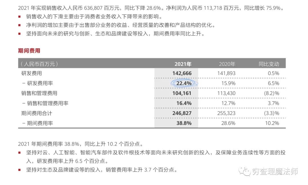 华为于28日下午在深圳总部举行2021年经营财报发布会,财报用一句话总结:收入少了,钱赚多了。2021年,华为收入为6368亿元人民币,同比下降28.6%;净利润为1137亿元,同比上升75.9%。 还有关于研发投入方面:孟晚舟表示,最大的财富不在报表上。“华为公司的真正价值在于:长期在研发上的投资,所沉淀和积累起来的研发能力、研发队伍、研发平台,这才是华为公司构建长期、持续竞争力的核心。”