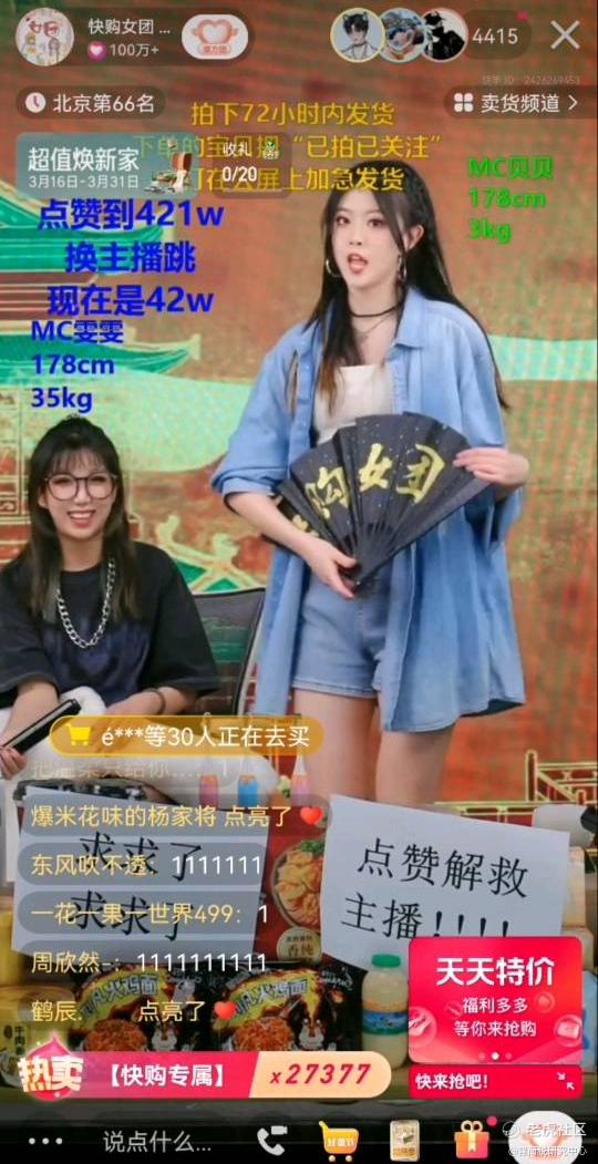 同样在快购女团的一场直播中,一位主播的体重,显示为35KG;而另一位主播的体重,竟然显示为3KG。现在这个时代,3KG的猫都不好找;如今出现了3KG的成年女人,真是让人瞬间笑出鼻涕泡。