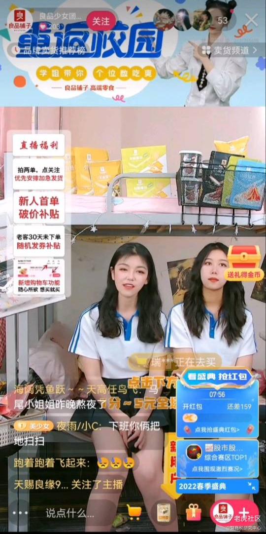 良品铺子的另一场直播中,背景就被布置成了女生宿舍的样子。两位穿着JK制服的小姐姐,坐在宿舍的下铺前后晃动、左右摇摆,劲爆的音乐声中,全是青春的影子。