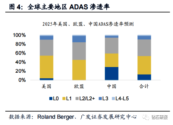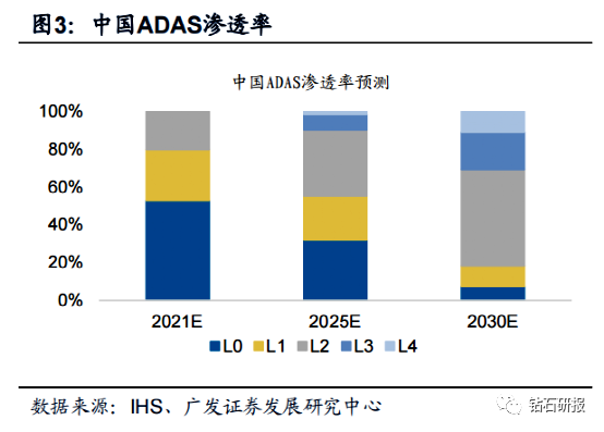 L2及以上车型渗透率目前较低。根据IHS预测,国内L0/L1级别自动驾驶渗透率在2021年仍占据约80%的主要市场份额,L2级别的自动驾驶占比约20%,到2025年国内L3/L4级别自动驾驶渗透率将达到9%。