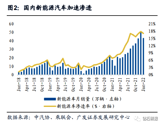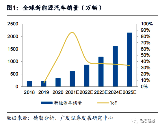 整体新能源汽车销量快速增长。根据德勤分析数据,2020年全球新能源汽车销量为326万辆,预计至2025年,全球新能源车销量将达2142万辆,5年复合增长率达37%。根据中汽协和乘联会数据,2021年国内新能源汽车销量约352万辆,同比增长157%,增长迅速。
