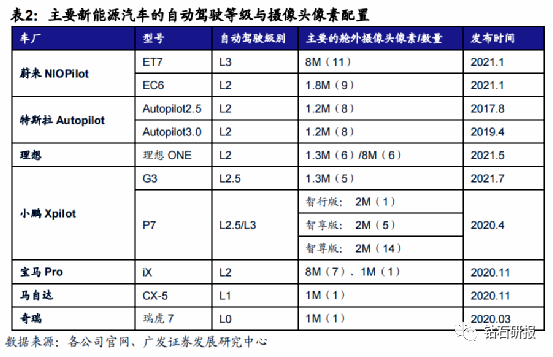 主流智能车型的摄像头像素配置。在不同的自动驾驶等级车型中,蔚来L3级别车型ET7使用的摄像头像素主要为8M高像素产品,L2级别EC6使用的主要为1.8M低像素产品;特斯拉L2级别车型配置的主要是1.2M低像素产品;理想和小鹏L2级别车型配置的多数也为2M以下低像素产品。