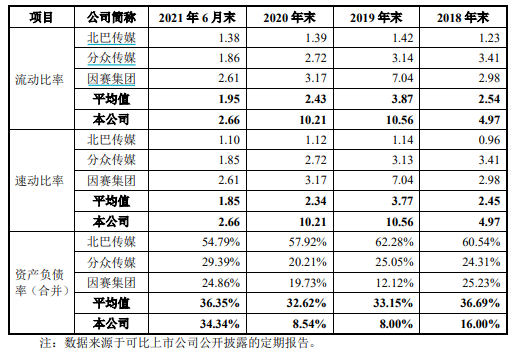 数据显示,兆讯传媒的收现比例相对较高,2018年以来兆讯传媒的销售商品提供劳务收到现金占总营收比例稳定维持在90%以上,这也使得公司能够保持较高的流动性。2018年至2021年上半年,公司的流动比率、速动比率常年超过2.5倍,可比公司的同期指标均低于兆讯传媒。