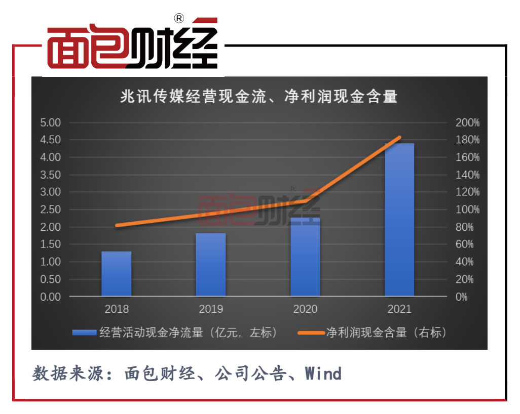 此外,兆讯传媒的获现能力较为优秀。2018年至2021年,公司经营现金流净额持续增加,2021年实现经营活动现金净流入4.41亿元,较2020年翻番。