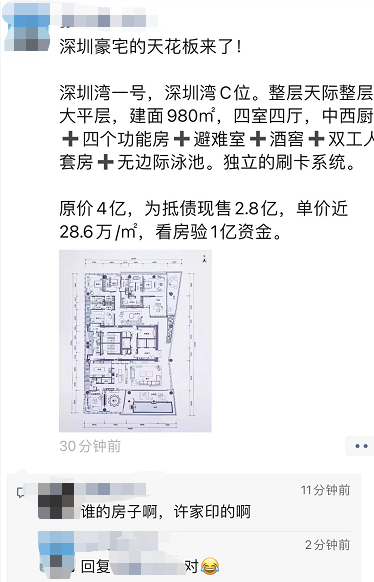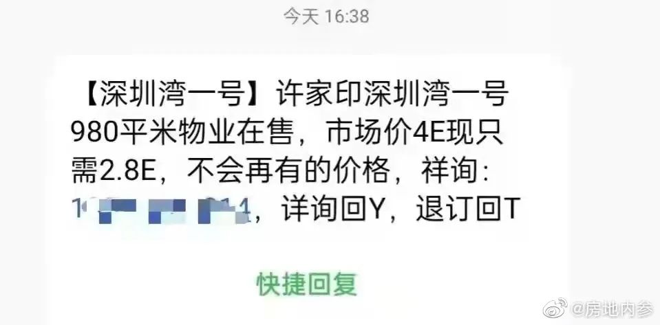 而网上,也有网友称收到许家印深圳湾一号980平米物业在售的短信。