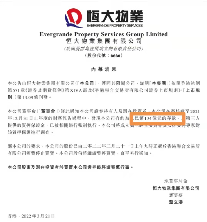 而在3月22日早间,中国恒大、恒大物业同时公告,恒大物业134亿人民币的存款被银行强制执行。截至2021年6月30日,恒大物业账上“现金及现金等价物”为人民币140亿元,净资产为118亿元。