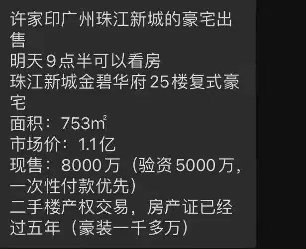 而在今年年初,据中介信息,许家印的广州豪宅也在出手。