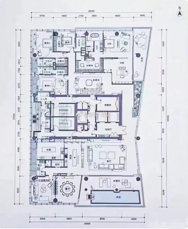 整层天际整层大平层,建面980㎡,四室四厅,中西厨+四个功能房+避难室+酒窖+双工人套房+无边游泳池。还有独立的刷卡系统。