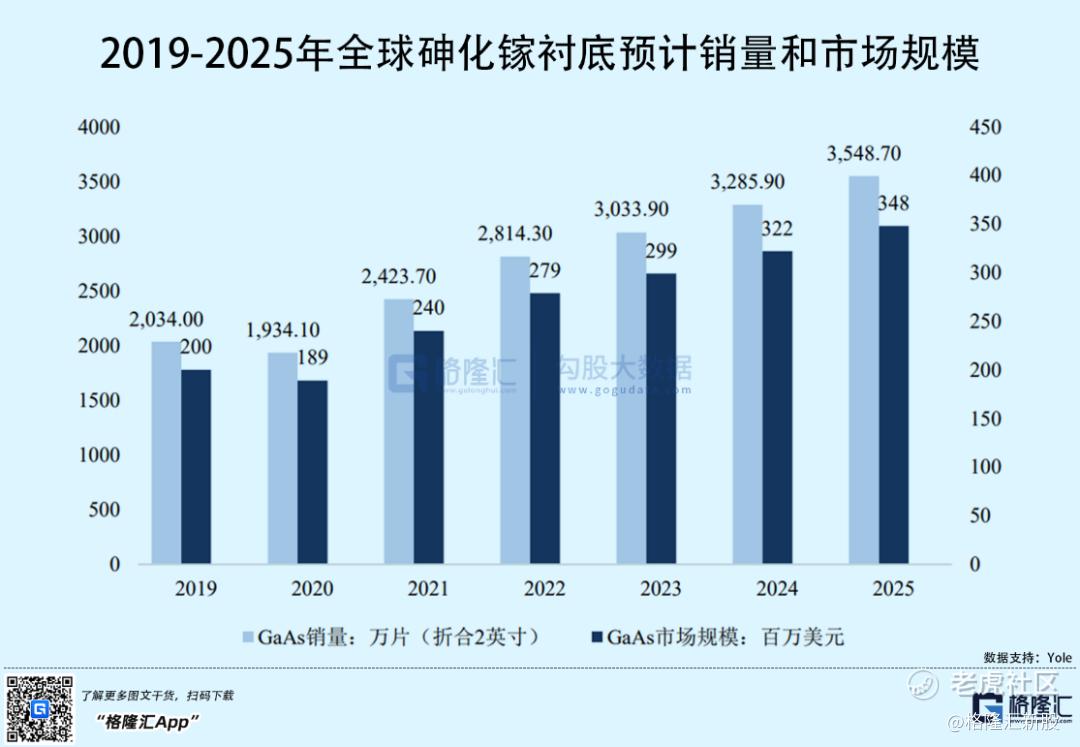 同样,砷化镓衬底市场规模也逐步扩大,2019年全球折合二英寸砷化镓衬底市场销量约为2000万片,预计到2025年全球折合二英寸砷化镓衬底市场销量将超过3500万片;2019年全球砷化镓衬底市场规模约为2亿美元,预计到2025年全球砷化镓衬底市场规模将达到3.48亿美元,2019-2025年复合增长率9.67%。