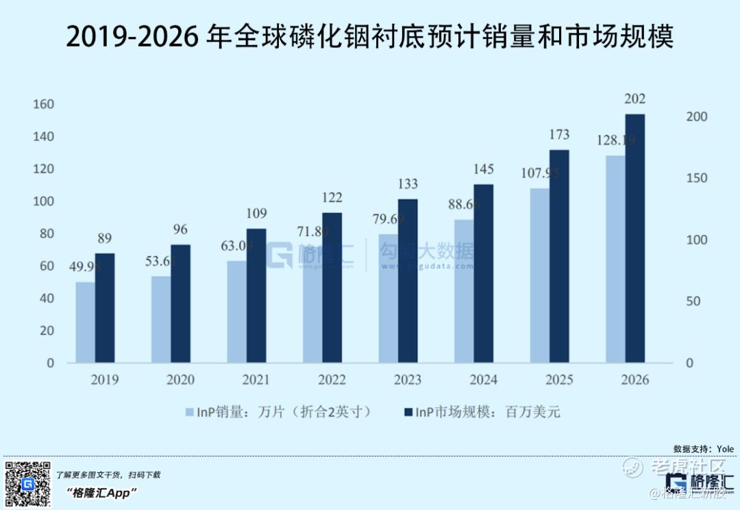 根据Yole预测,2026年全球磷化铟衬底(折合二英寸)预计销量为128.19万片,2019-2026 年复合增长率为14.40%;2026年全球磷化铟衬底市场规模为2.02亿美元,2019-2026年复合增长率为12.42%。