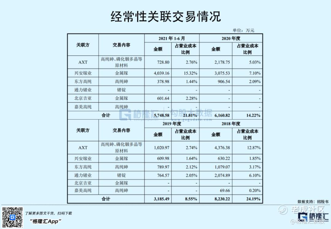 除此之外,通美晶体还向AXT进行关联采购。各报告期内,公司关联采购金额占营业成本的比例分别为24.19%、8.55%、14.22%、21.81%。