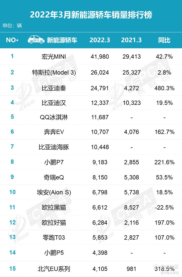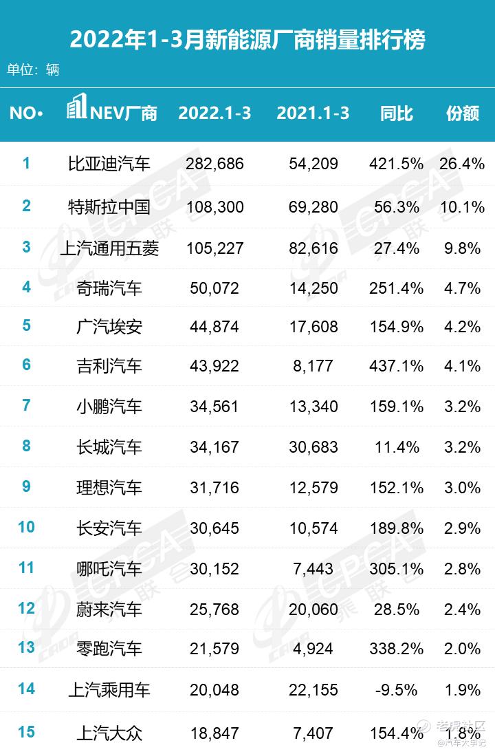在3月新能源汽车销量排行榜中,月销量首次突破十万辆的比亚迪以10.3万辆的成绩成为了毋庸置疑的冠军,鲇鱼特斯拉则紧跟其后,实现了6.6万辆的销量(含出口销量)。