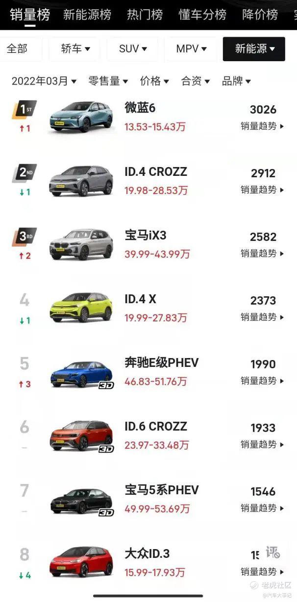 从细分市场来看,3月和一季度新能源轿车销量榜单前15名中,除了特斯拉Model 3,其余均为自主品牌产品,而在3月新能源SUV销量排行榜中,除了特斯拉Model Y,只有一款一汽大众ID.4 CROZZ以2912辆排在了第14位。