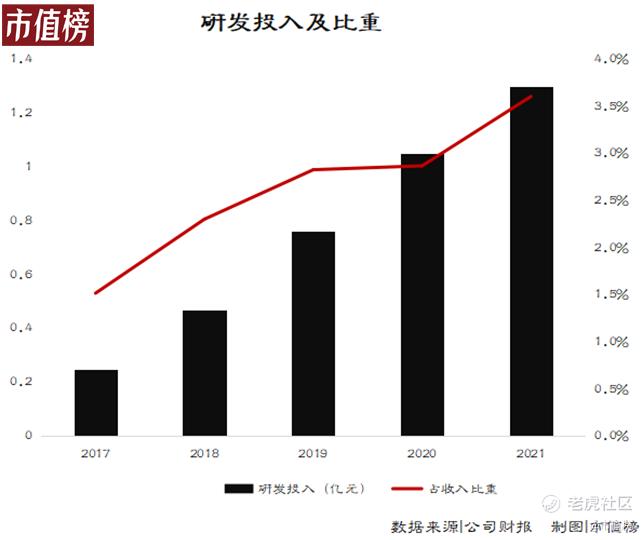 小熊电器在研发上的投入力度在逐渐增强,从2019年的7651.5万元增长至2021年的1.3亿元,占收入的比重从2.85%上升至3.6%。