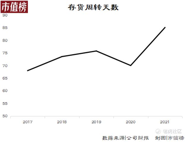 销售变慢,一方面是存货周转天数拉长,2021年小熊电器的存货周转天数为85.25天,比2020年、2019年分别拉长15天和9.3天,另一方面是生产出来但还没有卖出去的商品,即库存商品在存货中的占比越来越高,2021年为64.2%,比2020年和2019年分别增加7.4和9.6个百分点。