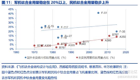 在军机中,钛合金的用量占比约20%左右。数据显示,我国最新机型歼-20的钛合金用量为20%,歼-31为25%。而当今世界上的先进战斗机F-22战斗机,钛用量更是高达41%。