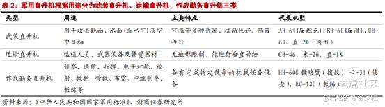 直升机不需要跑道,对起降场地要求低,能够进行低空、低速、机头方向不变的飞行,能够空中悬停等,具有固定翼飞机不可替代的优势。具体包括武装直升机、运输直升机和作战勤务直升机。