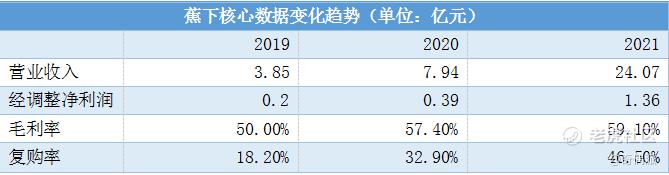 在其递交的招股书中,营收净利一栏的数据相当之华丽。2019年至2021年三年间,蕉下营业收入分别为3.8亿元、7.9亿元和24.1亿元。仅用三年时间营收便翻了6倍,年复合增长率高达150%。